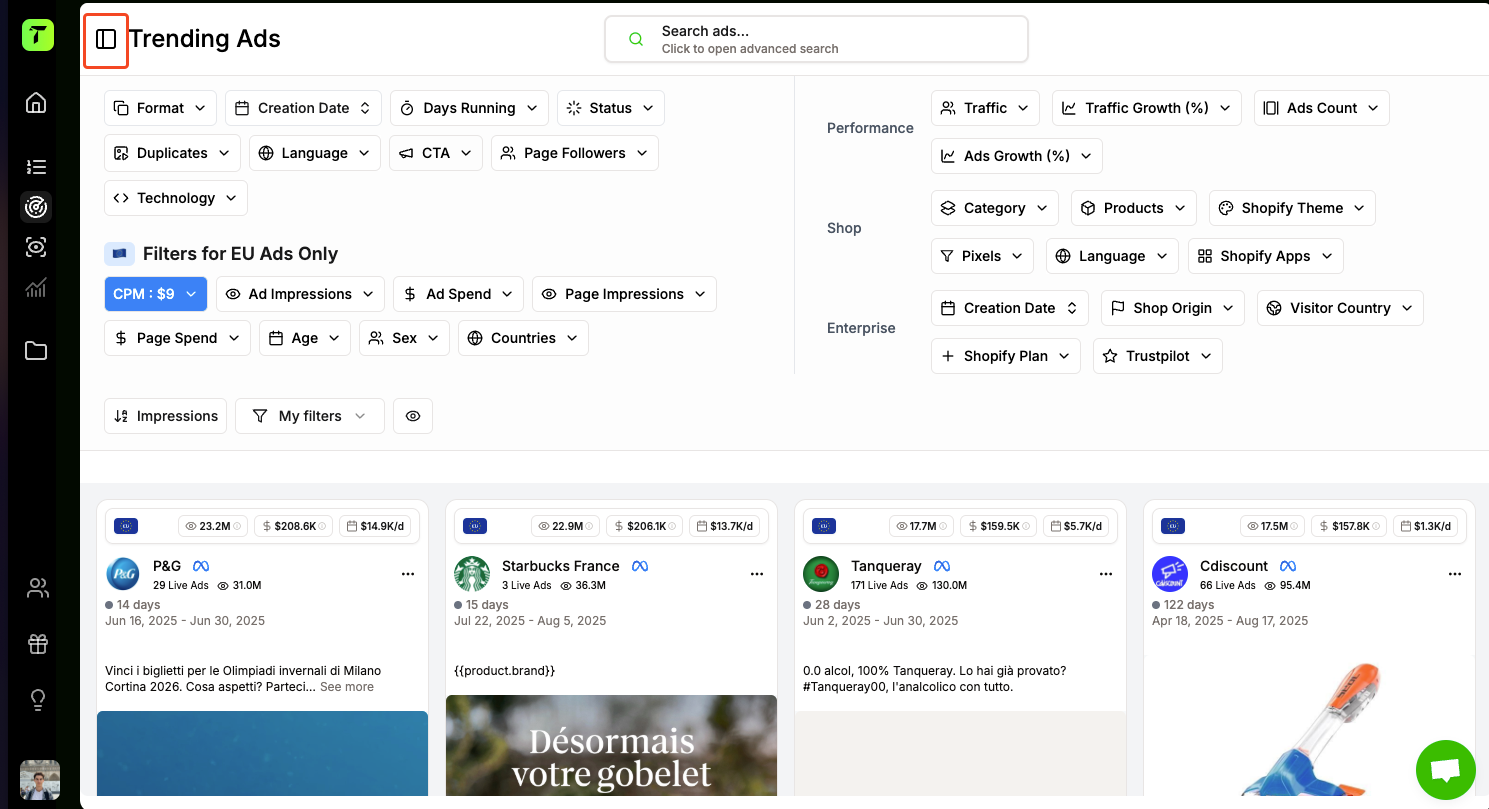 You can now collapse the sidebar with a single click, giving you more screen real estate to focus on what matters. Perfect for detailed creative analysis or when you're deep-diving into competitor strategies.